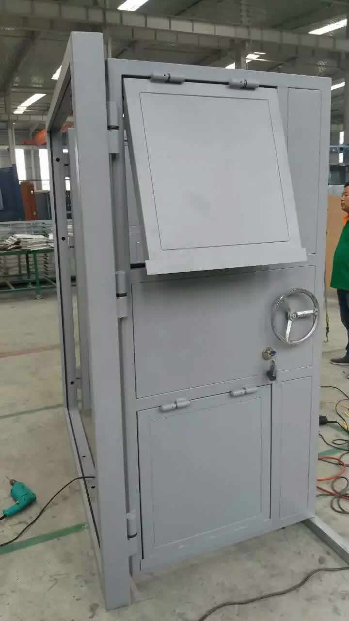 名称:钢质泄(压)爆门 材质说明: 门框选用100mm*50mm*3.0优质方管 门扇选用里外1.2mm优质钢板,门扇厚度74mm 门扇内部填充防爆骨架及硅酸铝 门扇与门框选用防爆承重门轴 门扇选用泄爆小扇 锁具选用防爆手轮锁加机械锁 门框门扇颜色为粉末静电喷涂